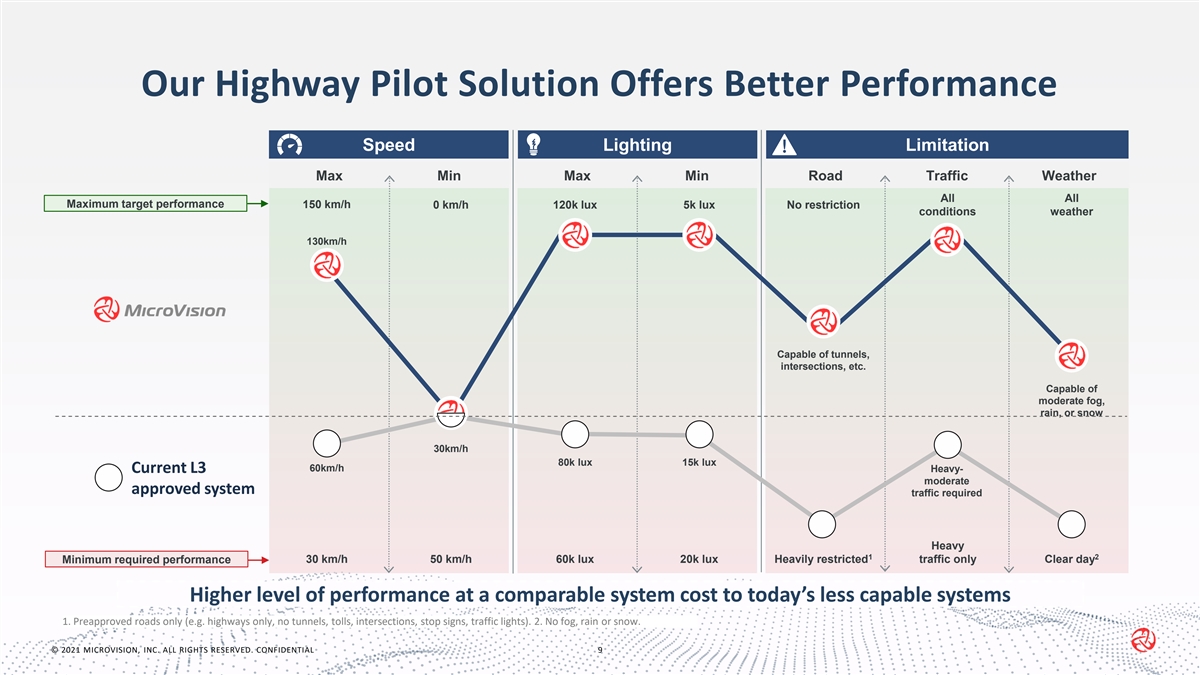 Our LiDAR Outperforms Others in the Market Data rate Frame latency Max field of Range Sun/LiDAR Module Wavelength 1 2 (pts/sec) (Hz) view (H x V) (m @ 10% refl.) interference cost (nm) Lowest while N/A Example OEM specs≥ 4,000,000 24 100° x 25° 200 Immune meeting spec. 10,800,000 30 100° x 25° 220 Immune $ 905 3 Competitor A Not disclosed 20 120° x 30° 250 Immune $$$ 1550 3 Competitor B Not disclosed 20 125° x 40° 220 Partial $$ 905 Competitor C ~445,000 25 133° x 10° 100 Partial $ 905 Competitor D ~250,000 25 60° x 30° 140 Partial $$ 885 Competitor E 945,000 5,10,20 60° x 20° < 300 Partial $$ 1550 Competitor F 15,000 20 177.5° x 16° 20 Partial $$$ 905 = At/Exceed OEM specs 1. H = Horizontal, V = Vertical. 2. Based on estimate BoMs. 3. Publicly available specs unclear. Source: product data sheets, company websites, investor presentations © 2021 MICROVISION, INC. ALL RIGHTS RESERVED. CONFIDENTIAL 8