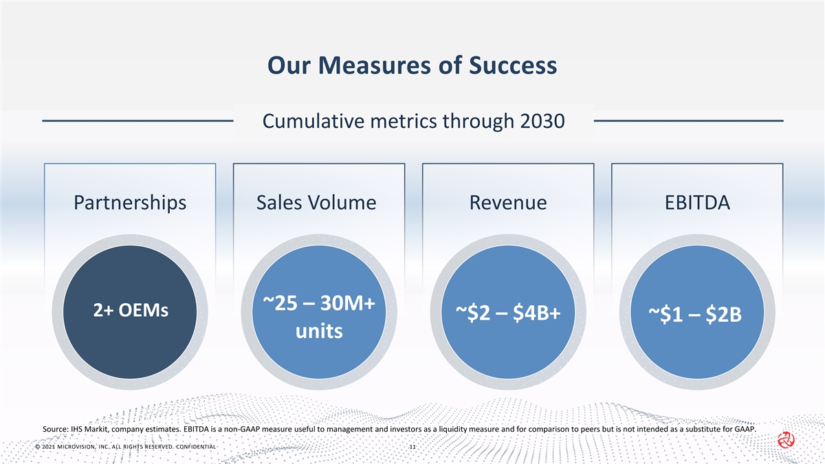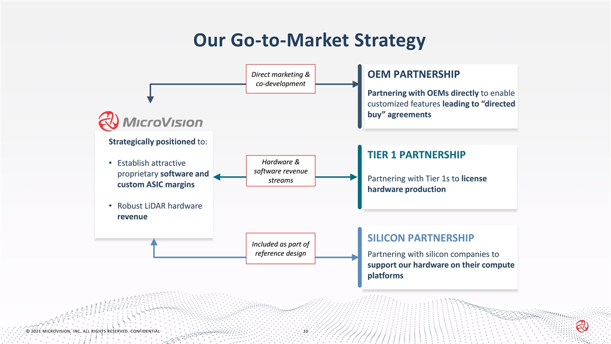 Our Go-to-Market Strategy Direct marketing & OEM PARTNERSHIP co-development Partnering with OEMs directly to enable customized features leading to “directed buy” agreements Strategically positioned to: TIER 1 PARTNERSHIP Hardware & • Establish attractive software revenue proprietary software and Partnering with Tier 1s to license streams custom ASIC margins hardware production • Robust LiDAR hardware revenue SILICON PARTNERSHIP Included as part of reference design Partnering with silicon companies to support our hardware on their compute platforms © 2021 MICROVISION, INC. ALL RIGHTS RESERVED. CONFIDENTIAL 10