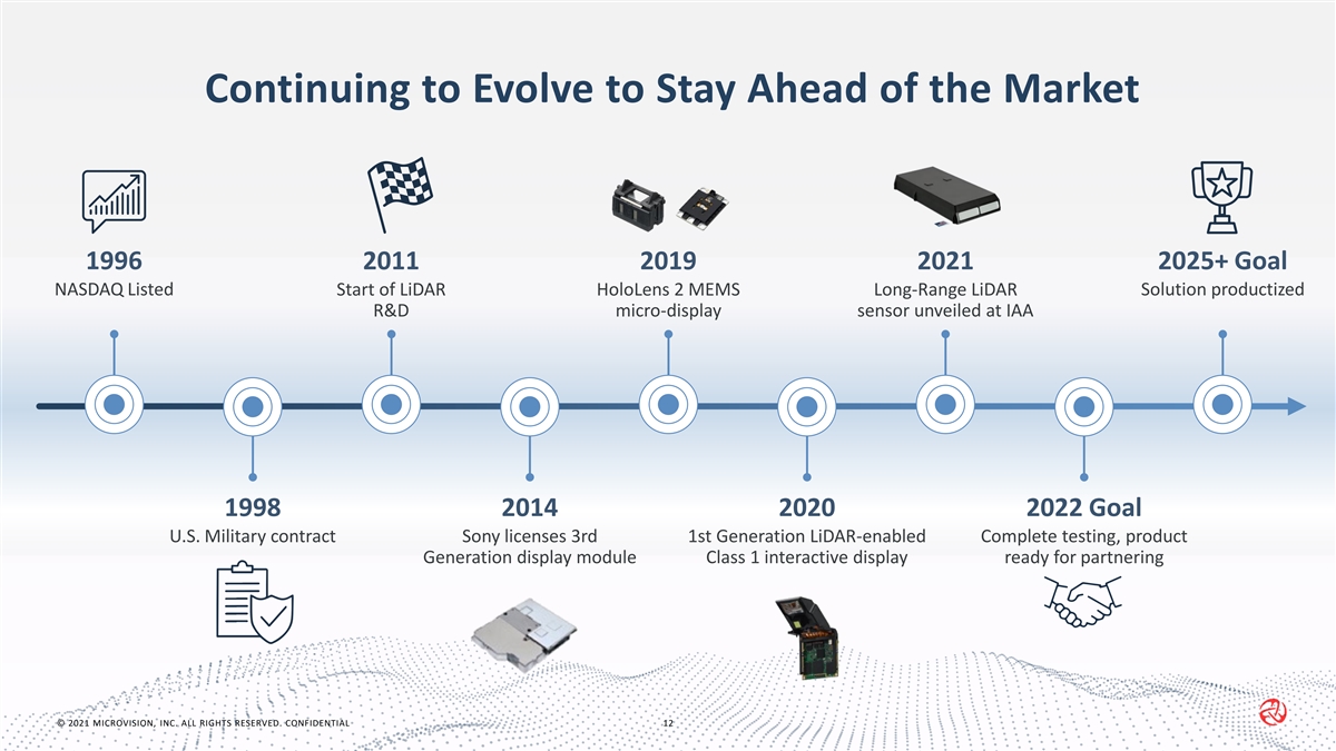 Our Measures of Success Cumulative metrics through 2030 Partnerships Sales Volume Revenue EBITDA ~25 – 30M+ 2+ OEMs ~$2 – $4B+ ~$1 – $2B units Source: IHS Markit, company estimates. EBITDA is a non-GAAP measure useful to management and investors as a liquidity measure and for comparison to peers but is not intended as a substitute for GAAP. © 2021 MICROVISION, INC. ALL RIGHTS RESERVED. CONFIDENTIAL 11