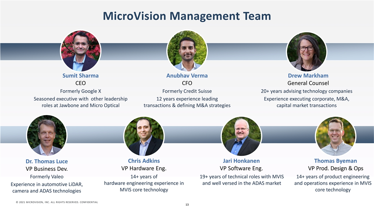 Continuing to Evolve to Stay Ahead of the Market 1996 2011 2019 2021 2025+ Goal NASDAQ Listed Start of LiDAR HoloLens 2 MEMS Long-Range LiDAR Solution productized R&D micro-display sensor unveiled at IAA 1998 2014 2020 2022 Goal U.S. Military contract Sony licenses 3rd 1st Generation LiDAR-enabled Complete testing, product Generation display module Class 1 interactive display ready for partnering © 2021 MICROVISION, INC. ALL RIGHTS RESERVED. CONFIDENTIAL 12