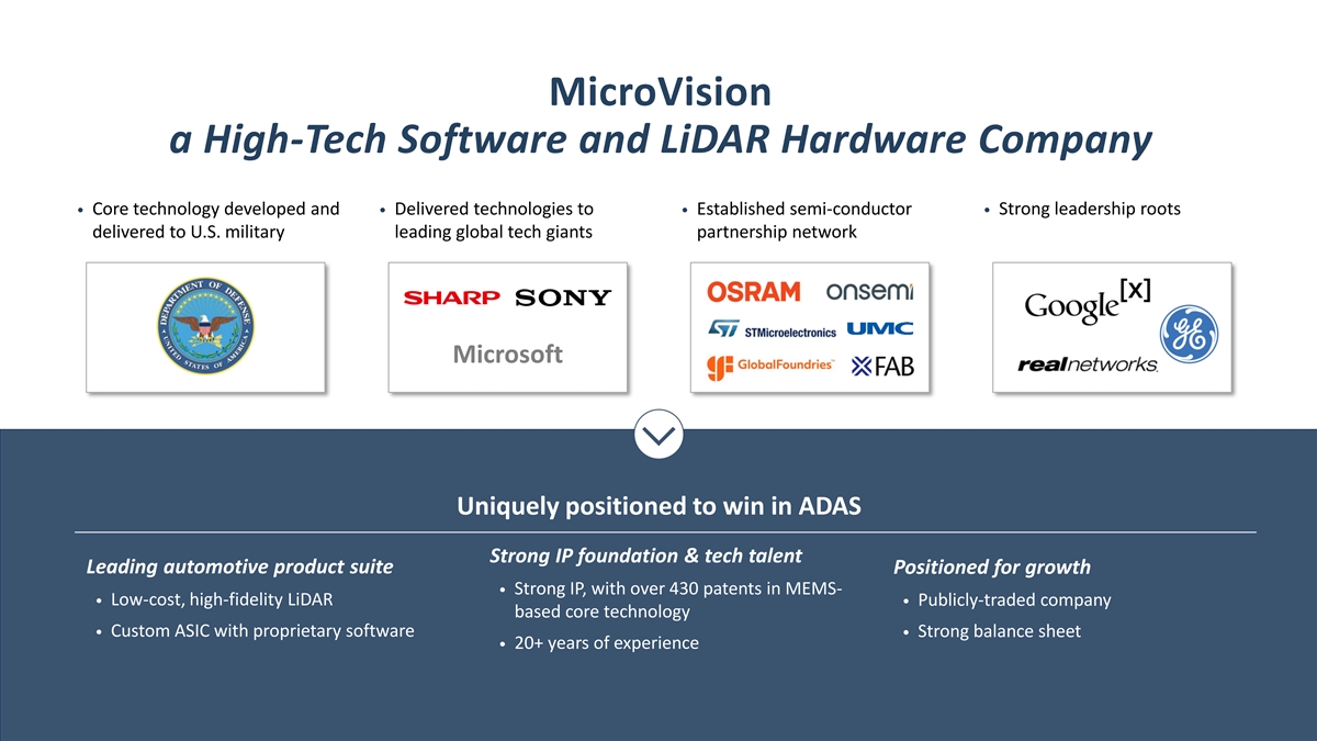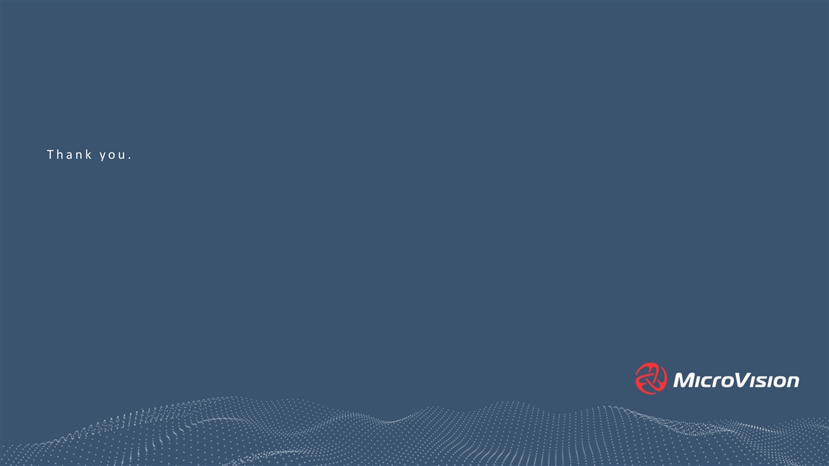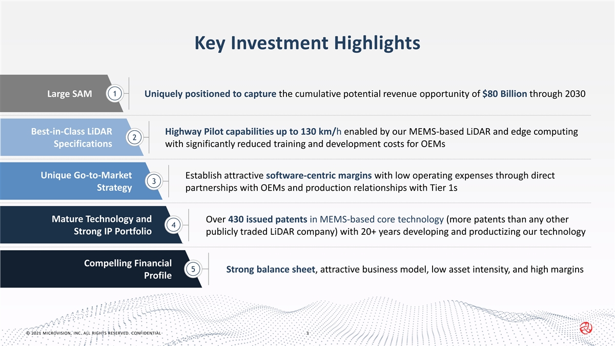 Safe Harbor Statements This presentation of MicroVision, Inc. (“MicroVision,” “the Company,” “we,” or “our”), and any accompanying oral presentation, contains forward-looking statements within the meaning of Section 27A of the Securities Act of 1933, as amended, and Section 21E of the Securities Exchange Act of 1934, as amended. Such statements include, among others: statements relating to expectations regarding our future growth, profitability, market position and addressable market size; projections, estimates and targets; our financial condition and liquidity; our business strategies; our product plans and partnerships; and future product performance. All statements contained in this presentation that do not relate to matters of historical fact should be considered forward-looking statements. These statements reflect our expectations, assumptions and estimates as of the date of this presentation, and actual results may differ materially from the results predicted. The preparation of forward-looking financial guidance requires us to make estimates and assumptions; actual results may differ materially from these estimates under different assumptions or conditions. Factors that could cause actual results for MicroVision to differ from the results predicted include: our history of operating losses; challenges caused by the COVID-19 pandemic; the need for additional capital; potential dependence on third party partners, including licensing partners and contract manufacturers; risks related to our technology; quarterly financial and stock price performance; continued listing of our stock; successful monetization of our product solution; competitive risks; risks associated with key customer or strategic relationships and activities; disruptions in the global financial markets and supply chains; and legal and regulatory risks. More information about potential risk factors that could affect our business and financial results is included in MicroVision’s latest annual report on Form 10-K for the year ended December 31, 2020, subsequent quarterly reports on Form 10-Q, and other reports and documents filed by MicroVision from time to time with the U. S. Securities and Exchange Commission (“SEC”). Except as required by law, we assume no obligation to update any information in this presentation to reflect events or circumstances in the future, even if new information becomes available. Unless otherwise indicated, information contained in this presentation concerning our industry, competitive position and the markets in which we operate is based on information from independent industry and research organization other third-party sources and management estimates. Management’s estimates are derived from publicly available information released by independent industry analysts and other third-party sources, as well as data from our internal research, and are based on assumptions made by us that we believe to be reasonable. In addition, projections, assumptions and estimates of future industry and Company performance are necessarily subject to uncertainty and risk due to a variety of factors, including those described above and in our SEC filings. These and other factors could cause results to differ materially from those expressed in the estimates made by independent parties and by MicroVision. MicroVision has rights to various trademarks, service marks and trade names used in connection with the operation of our business. This presentation also contains trademarks, service marks and trade names of third parties, which are the property of their respective owners. The use or display of third parties’ trademarks, service marks, trade names or products in this presentation is not intended, and does not imply, a relationship with MicroVisions, or an endorsement or sponsorship by or of MicroVision. Solely for convenience, the trademarks, service marks and trade names referred to in this presentation may appear without the ®, TM or SM symbols, but such references are not intended to indicate, in any way, that MicroVision will not assert, to the fullest extent under applicable law, its rights or the right of the applicable licensor in these trademarks, service marks and trade names. © 2021 MICROVISION, INC. ALL RIGHTS RESERVED. CONFIDENTIAL 1