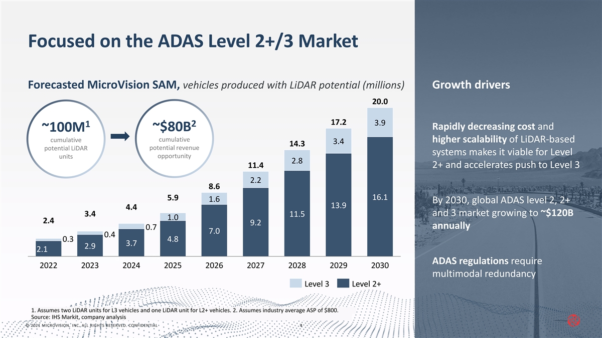 Key Investment Highlights 1 1 Large SAM Uniquely positioned to capture the cumulative potential revenue opportunity of $80 Billion through 2030 Best-in-Class LiDAR Highway Pilot capabilities up to 130 km/h enabled by our MEMS-based LiDAR and edge computing 1 2 Specifications with significantly reduced training and development costs for OEMs Unique Go-to-Market Establish attractive software-centric margins with low operating expenses through direct 3 1 Strategy partnerships with OEMs and production relationships with Tier 1s Mature Technology and Over 430 issued patents in MEMS-based core technology (more patents than any other 4 1 Strong IP Portfolio publicly traded LiDAR company) with 20+ years developing and productizing our technology Compelling Financial 5 1 Strong balance sheet, attractive business model, low asset intensity, and high margins Profile © 2021 MICROVISION, INC. ALL RIGHTS RESERVED. CONFIDENTIAL 3