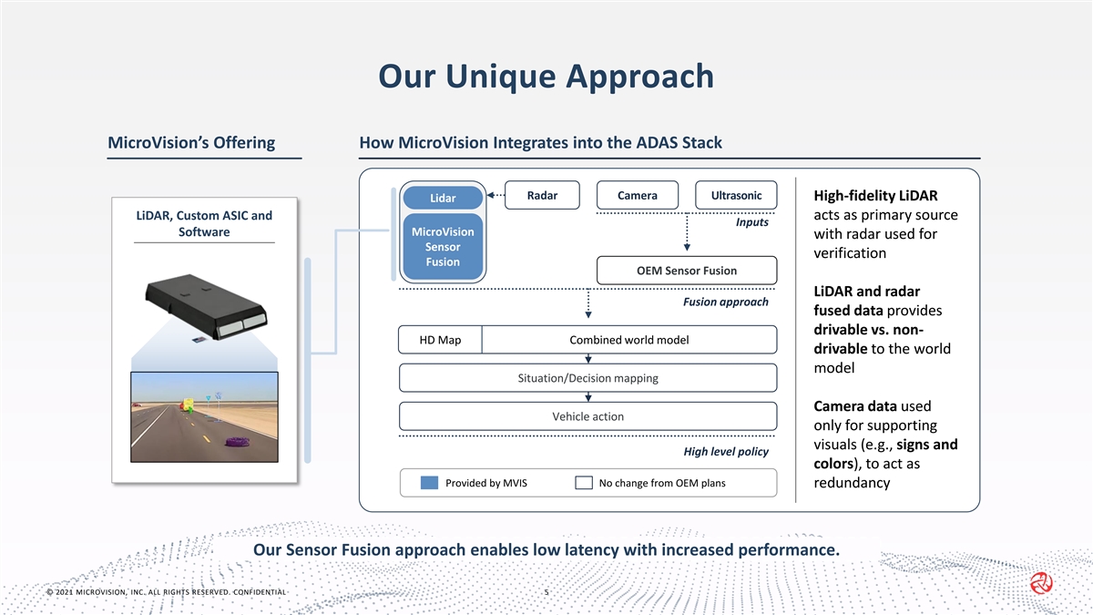 Focused on the ADAS Level 2+/3 Market Forecasted MicroVision SAM, vehicles produced with LiDAR potential (millions) Growth drivers 20.0 17.2 3.9 1 2 Rapidly decreasing cost and ~$80B ~100M cumulative cumulative higher scalability of LiDAR-based 3.4 14.3 potential LiDAR potential revenue systems makes it viable for Level opportunity units 2.8 11.4 2+ and accelerates push to Level 3 2.2 8.6 5.9 16.1 1.6 By 2030, global ADAS level 2, 2+ 13.9 4.4 and 3 market growing to ~$120B 3.4 11.5 1.0 2.4 9.2 annually 0.7 7.0 0.4 0.3 4.8 3.7 2.9 2.1 0.6 0.5 0.5 0.4 ADAS regulations require 2022 2023 2024 2025 2026 2027 2028 2029 2030 multimodal redundancy Level 3 Level 2+ 1. Assumes two LiDAR units for L3 vehicles and one LiDAR unit for L2+ vehicles. 2. Assumes industry average ASP of $800. Source: IHS Markit, company analysis © © 2 20 02 21 1 M MI IC CR RO OV VI IS SI IO ON N, , I IN NC C. . A AL LL L R RI IG GH HT TS S R RE ES SE ER RV VE ED D. . C CO ON NF FI ID DE EN NT TI IA AL L 4