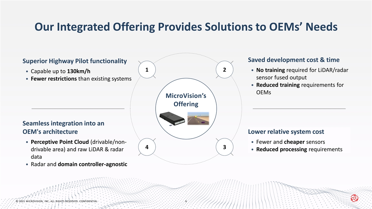 Our Unique Approach MicroVision’s Offering How MicroVision Integrates into the ADAS Stack Radar Camera Ultrasonic High-fidelity LiDAR Lidar LiDAR, Custom ASIC and acts as primary source Inputs MicroVision Software with radar used for Sensor verification Fusion OEM Sensor Fusion LiDAR and radar Fusion approach fused data provides drivable vs. non- HD Map Combined world model drivable to the world model Situation/Decision mapping Camera data used Vehicle action only for supporting visuals (e.g., signs and High level policy colors), to act as Provided by MVIS No change from OEM plans redundancy Our Sensor Fusion approach enables low latency with increased performance. © 2021 MICROVISION, INC. ALL RIGHTS RESERVED. CONFIDENTIAL 5