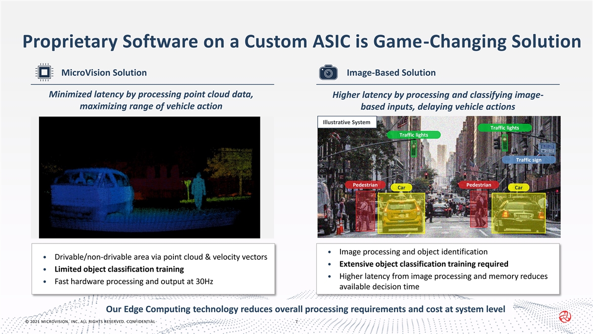 Our Integrated Offering Provides Solutions to OEMs’ Needs Saved development cost & time Superior Highway Pilot functionality 1 2 • No training required for LiDAR/radar • Capable up to 130km/h sensor fused output • Fewer restrictions than existing systems • Reduced training requirements for OEMs MicroVision’s Offering Seamless integration into an OEM's architecture Lower relative system cost • Perceptive Point Cloud (drivable/non-• Fewer and cheaper sensors 4 3 drivable area) and raw LiDAR & radar • Reduced processing requirements data • Radar and domain controller-agnostic © 2021 MICROVISION, INC. ALL RIGHTS RESERVED. CONFIDENTIAL 6