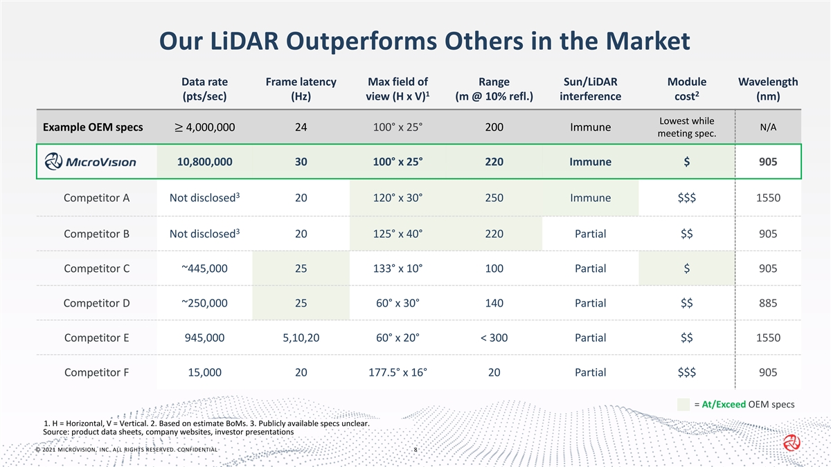Proprietary Software on a Custom ASIC is Game-Changing Solution MicroVision Solution Image-Based Solution Minimized latency by processing point cloud data, Higher latency by processing and classifying image- maximizing range of vehicle action based inputs, delaying vehicle actions Illustrative System Traffic lights Traffic lights Traffic sign Video placeholder Replacing image Video placeholder (to show point cloud and vector) Pedestrian Pedestrian Car Car (to show point cloud and vector) • Image processing and object identification • Drivable/non-drivable area via point cloud & velocity vectors • Extensive object classification training required • Limited object classification training • Higher latency from image processing and memory reduces • Fast hardware processing and output at 30Hz available decision time Our Edge Computing technology reduces overall processing requirements and cost at system level © 2021 MICROVISION, INC. ALL RIGHTS RESERVED. CONFIDENTIAL 7
